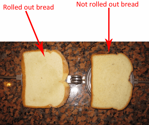 But! OCBD wrote in with a brilliant suggestion: use a rolling pin to flatten and stretch out your bread. Rolling out your slices of bread with a rolling pin and quite a bit of pressure can get you just a little bit more width out of your bread to more effectively cover your Toas-Tite sandwich maker. And a nice bonus is that you get a little more room for filling too!