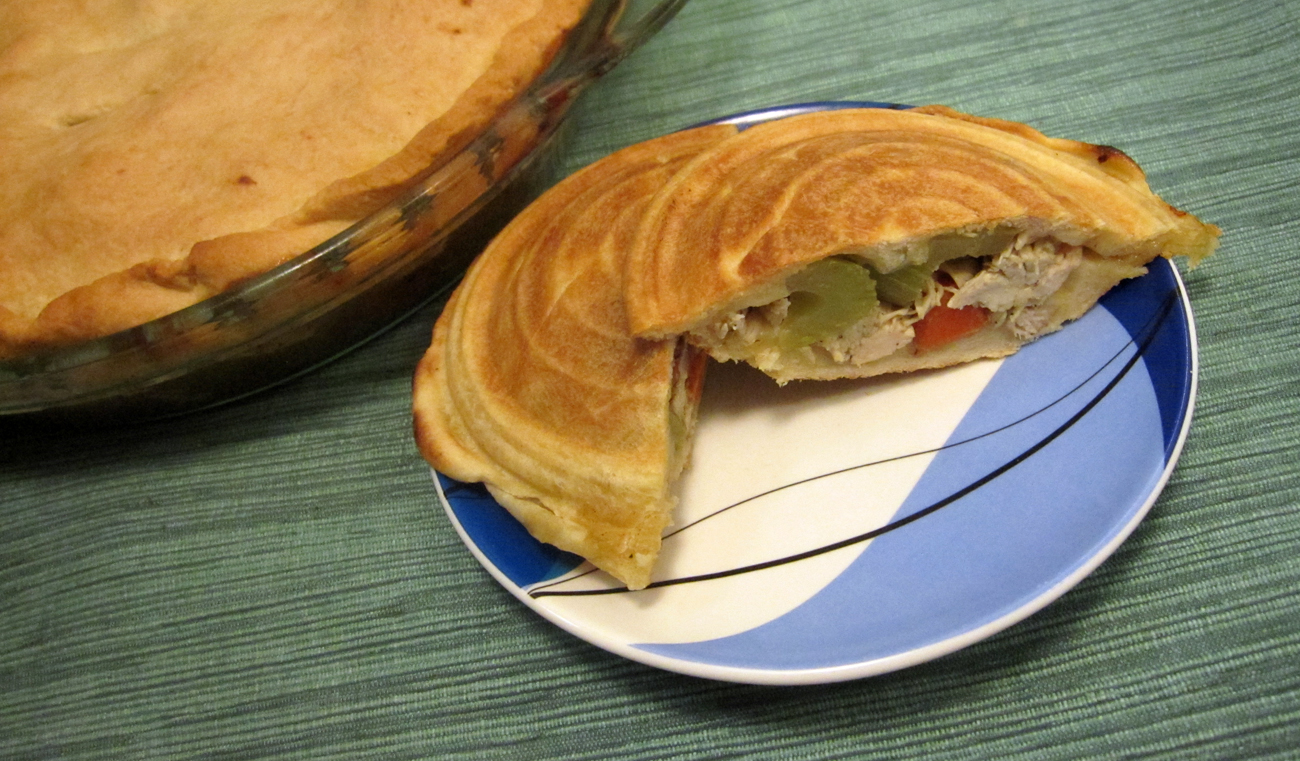 - Pour the chicken and veggies you set aside from your pie filling on top of your crust.