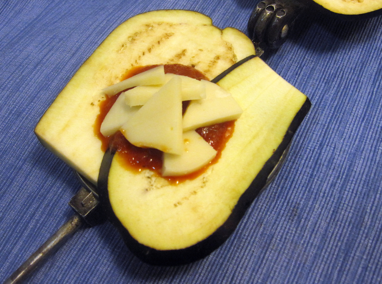 - On top of one piece of bread, layer your eggplant, sauce, and cheese.