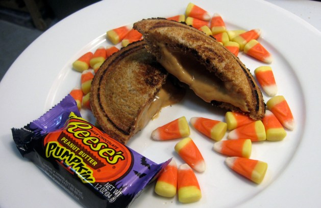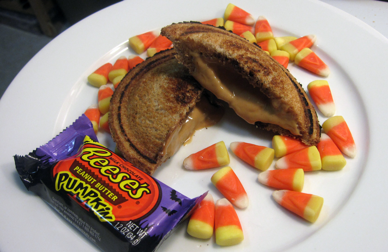 Two years ago…we failed at posting our Halloween Toas-Tite recipe on time. This year, we’re not only righting that wrong, we’re also making the meltier, delicious-er version since Reese’s are designed not to melt. So grab your fudge sauce and your peanut butter and try this homemade pudgy pie to get your Halloween candy / Reese’s fix. And you can definitely have some extra Halloween candy on the side.