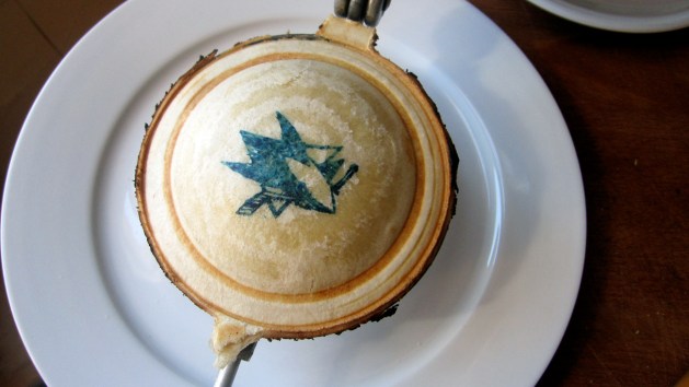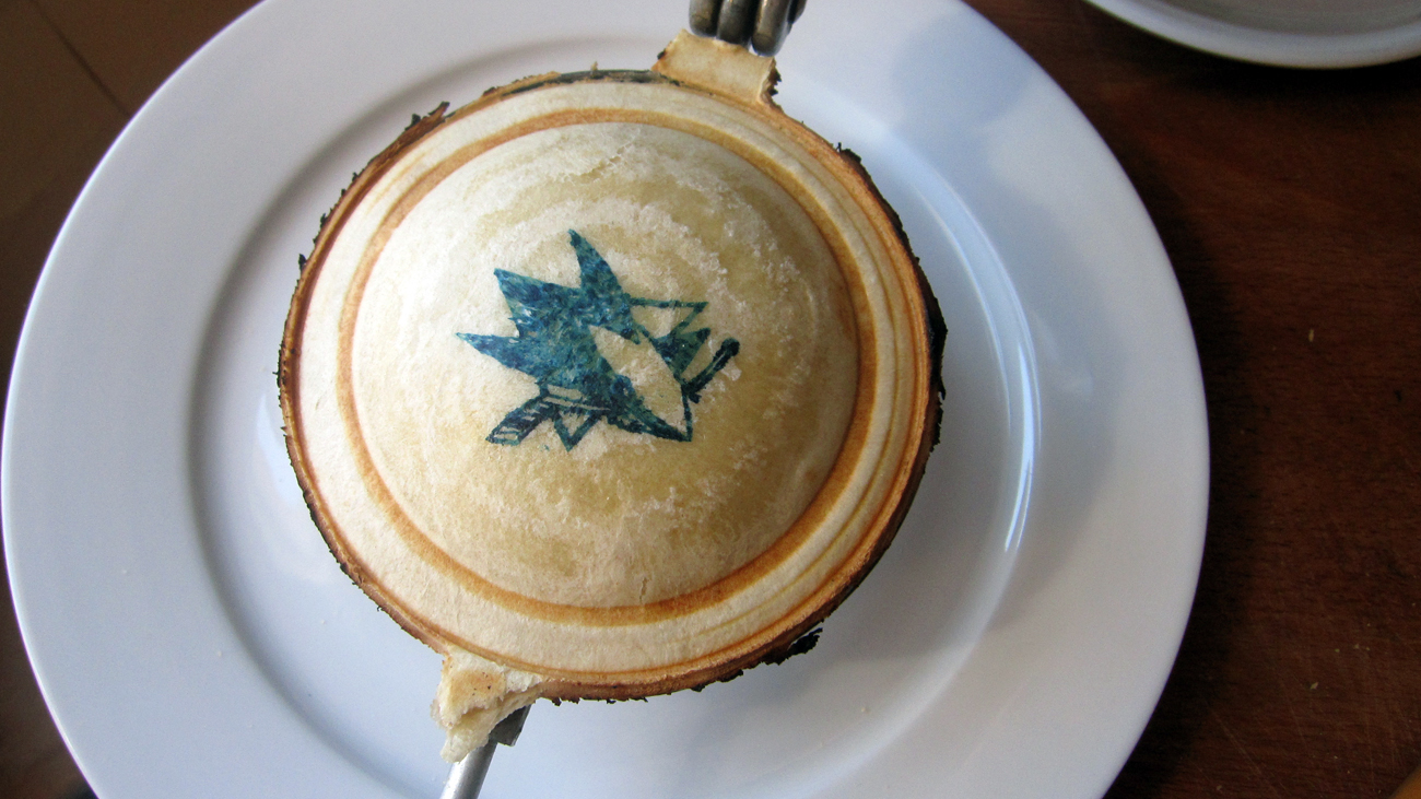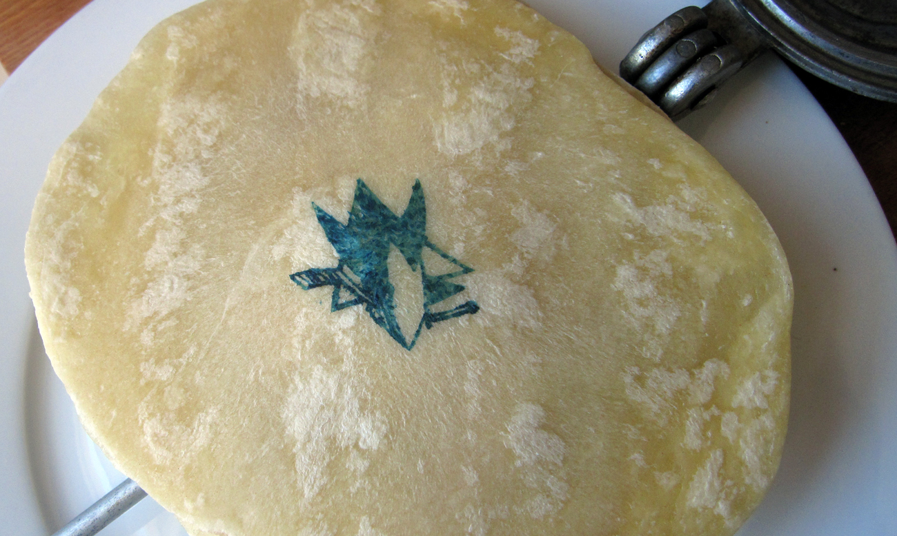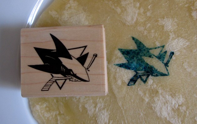 So we decided to make a nacho Toas-Tite but we wanted to make it even more Sharkie. Then a lightening bolt hit. What if we got a custom rubber stamp with the Sharks logo and then stamped our sandwich with food coloring? It was worth a shot! So we got our stamp for the bargain price of $12. Then it was time to get Toas-Titing.