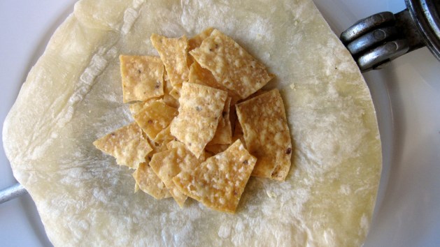 To get the stamp to display as best it could, we knew we would need a dense bread for our crust, otherwise the detail of the stamp would be missing. We thought about rolling out white bread but partially to keep the nacho theme going and partially to get a better stamp, we decided to go with flour tortillas. Once we had our “bread” picked, the food coloring came out. The first time we tried the stamp, we put several drops of food coloring onto a plate, dipped it, and stamped. Unfortunately, it didn’t turn out so well. There were droplets of food coloring in the wrong place and in some places, not enough. So we changed our tactic and used a Q-tip to spread food coloring on the stamp. Then we pressed hard on the tortilla that would make one side of our Toas-Tite’s crust. And that time, it worked brilliantly.