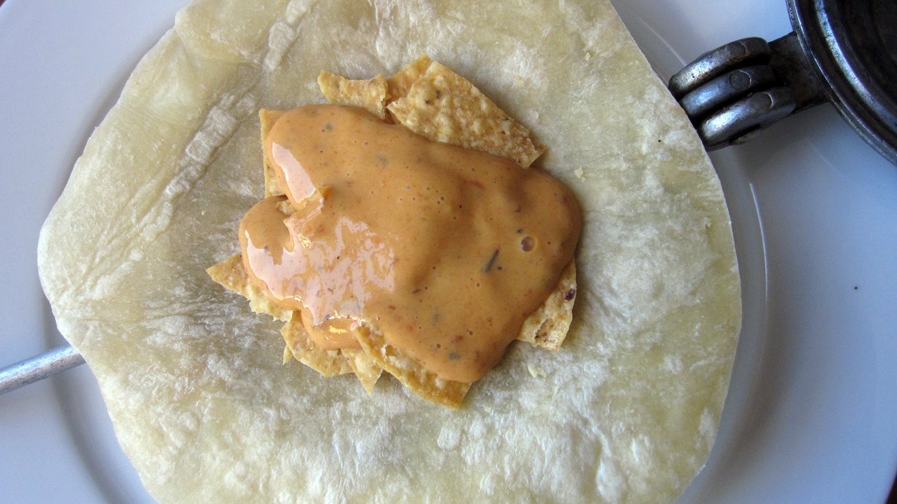 The other critical element to this recipe is the nacho cheese. Not just because nacho cheese is part of a fantastic joke, but because it adds the flavor and the pizzazz to the sandwich. The cheese is really what makes the nacho. We’ve used Toastitos Salsa Con Queso in the past (spiced up with extra salsa) but you can also make your own – we’ve even heard using Velveeta is good.
