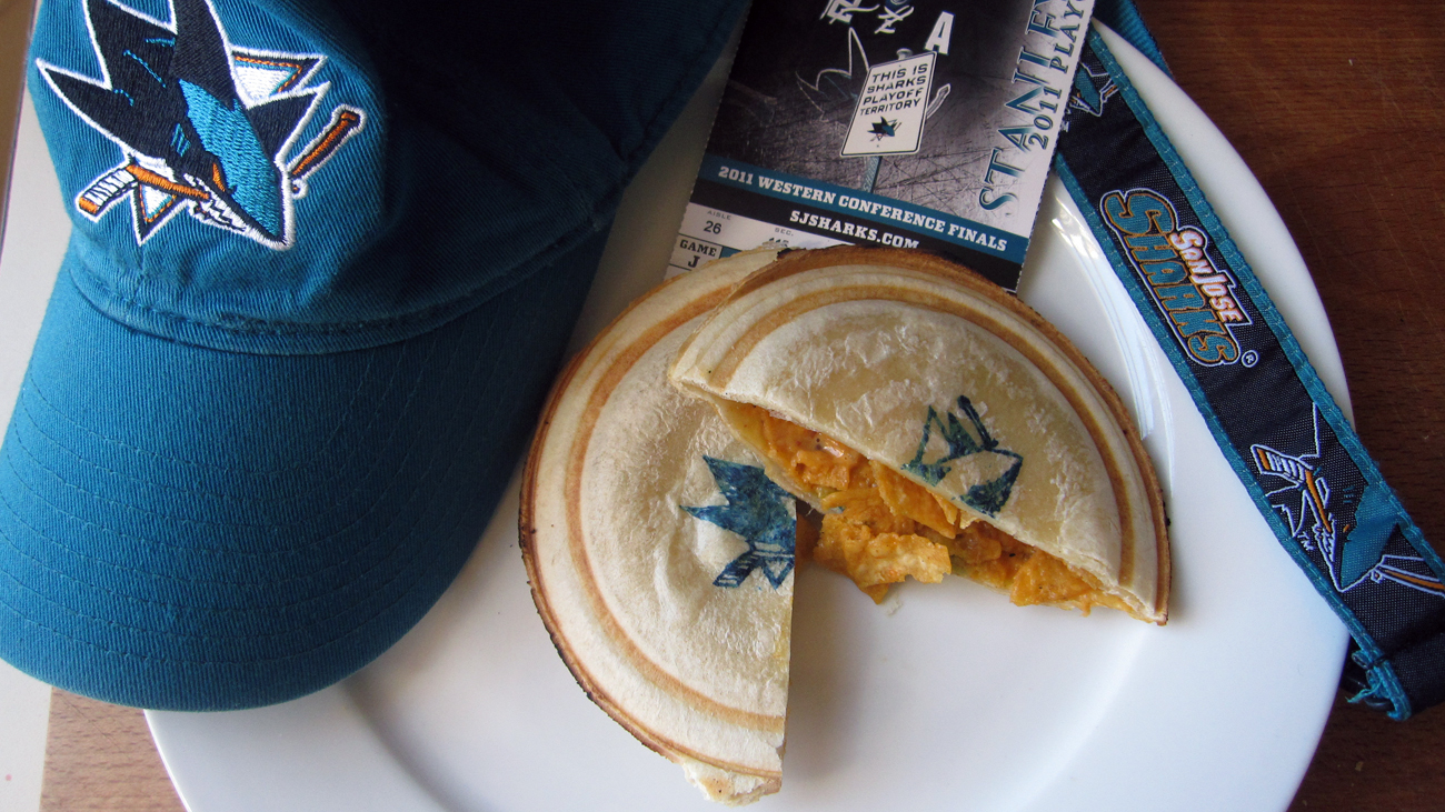 Alright, now let’s get serious. This Toas-Tite recipe is in honor of two things. First, the San Jose Sharks. Boy and I are pretty big Sharks fans. We watch most games and try to go to as many as we can. We have hats…shirts…sweatshirts…lanyards…magnets…even a 20th anniversary Sharks blanket. So of course, we had to have a Sharks Toas-Tite because we bleed teal. Second, nachos. Nachos are a classic sporting event food, plus we can make cheesy (har har har) hockey-related jokes like saying they’re chippy. (More har har har!)