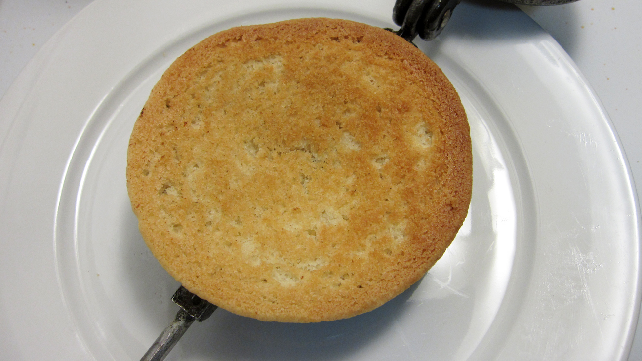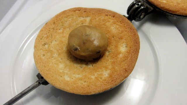 - After you’ve prepped your cookie dough, make your favorite sugar cookie recipe. You’ll need two rather large sugar cookies which ideally are slightly underbaked and warm so they’ll be pliable in the Toas-Tite grill.