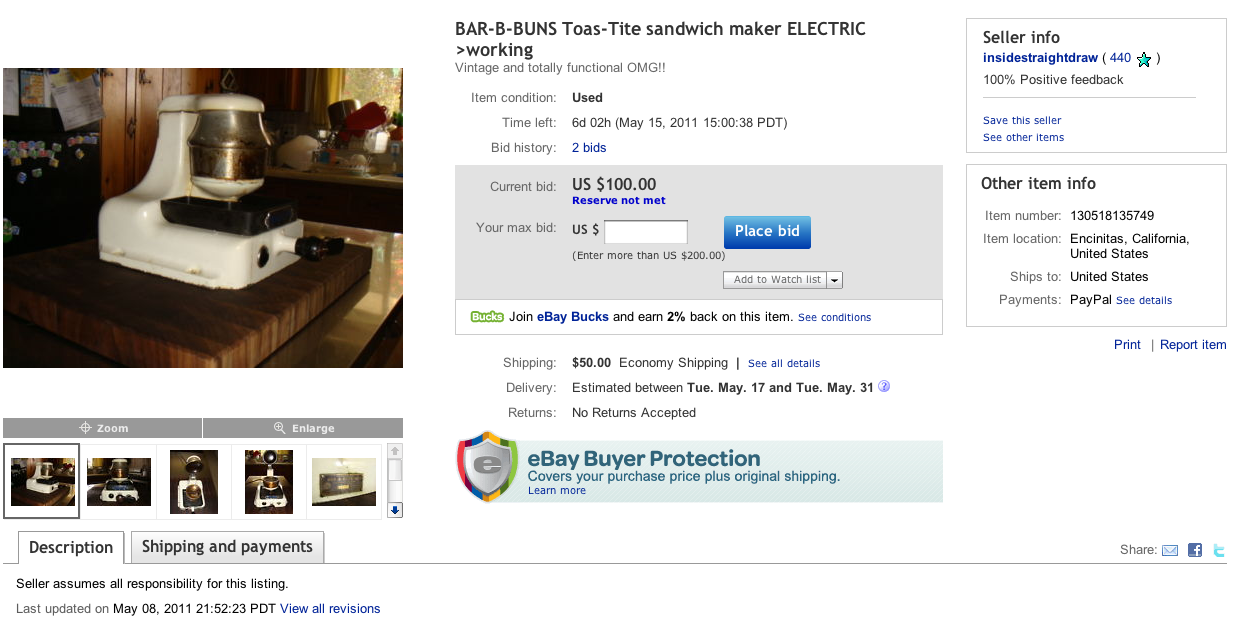 In August 2010, Boy and I saw a Toas-Tite come up for sale on eBay. It was unlike anything we’d ever seen. It was industrial sized and electric. We could hardly believe that it was actually a Toas-Tite! The seller was based in Florida and we sent him a message to learn more about it, but unfortunately, he was unresponsive and 2 days after the sale went up, it was taken down without the auction finishing. Luckily, I did manage to grab the photo and a screenshot of the auction before it disappeared:
