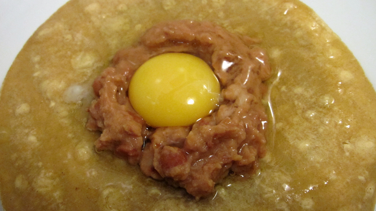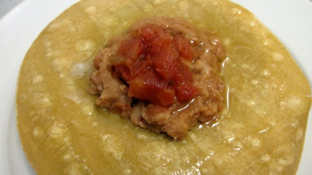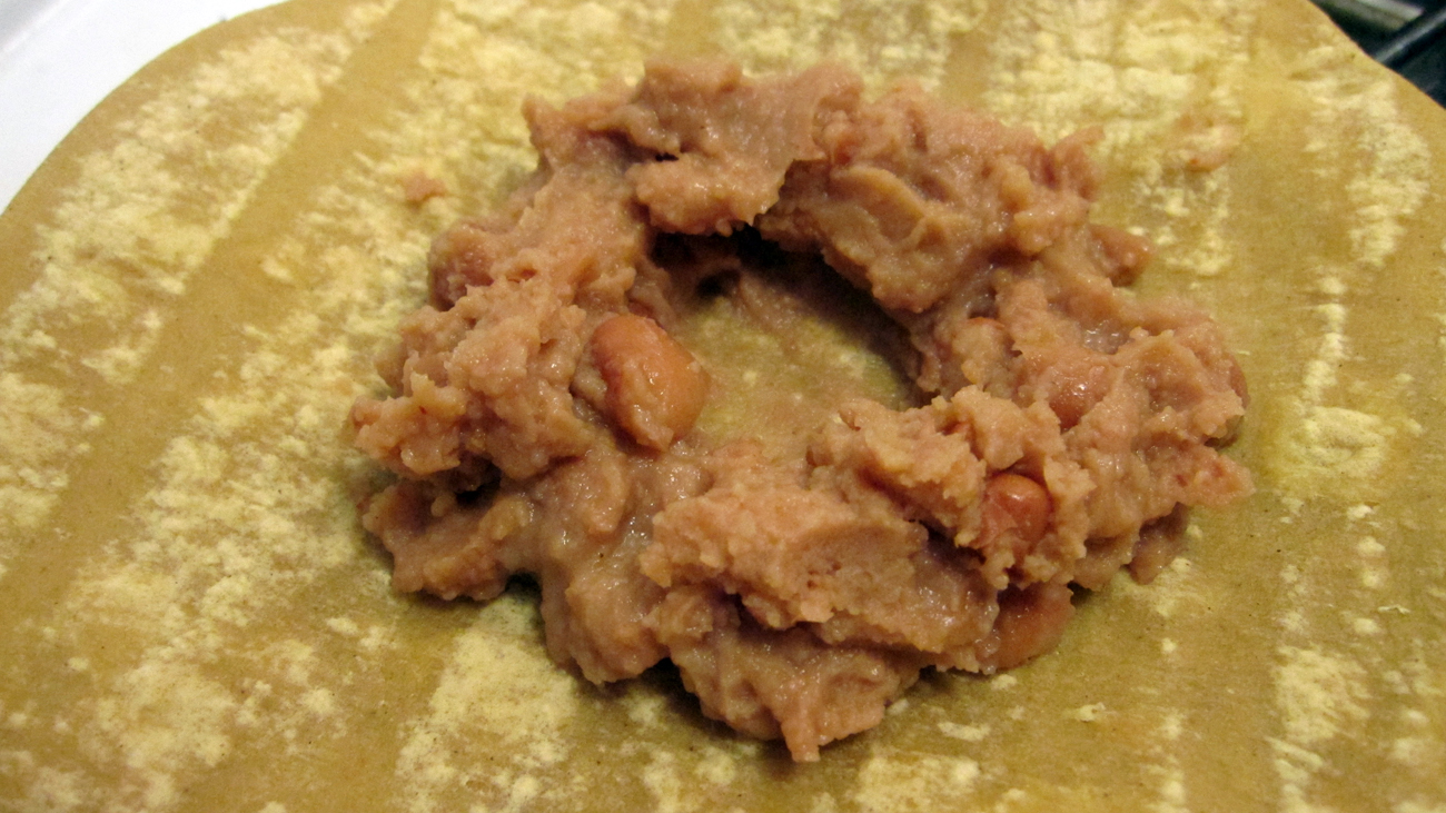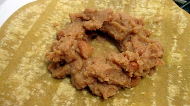 - Dollop 2 tablespoons of refried beans onto the tortilla. Make a small ring with the beans with a hole in the center where your egg yolk will sit.