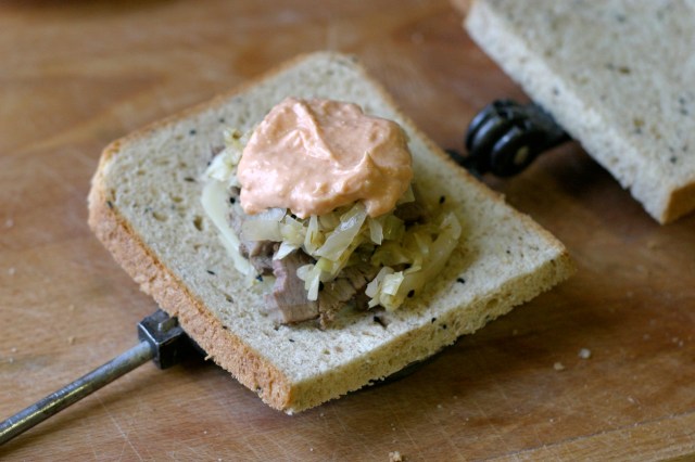 2. On one slice of bread (not the buttered side), layer the Swiss cheese, sauerkraut, beef, and dressing. Sandwiching the beef between the sauerkraut and the dressing will help keep the meat moist.