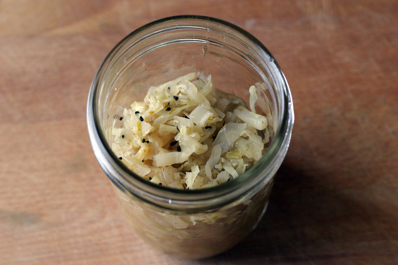 1. In a medium pot, add the cabbage, apple juice, vinegar, water, dill, mustard, and caraway seeds and bring to a boil.