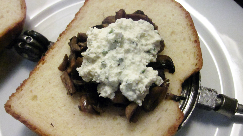 - Place your sauteed mushrooms into the middle of one slice of bread and top with the cheese.